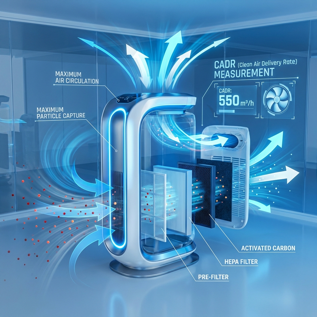 El CADR mide cuántos metros cúbicos de aire limpio puede entregar un purificador en una hora. Se expresa en m³/h (o CFM en USA).