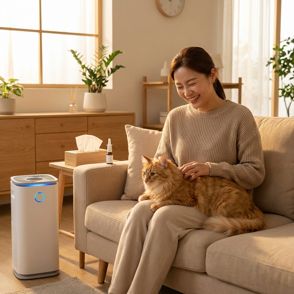 Un purificador no elimina la fuente del problema (tu mascota sigue produciendo alérgenos), pero sí reduce drásticamente la concentración de partículas en el aire. Estudios muestran que un buen purificador HEPA puede reducir los niveles de alérgenos en un 50-70% en pocas horas.